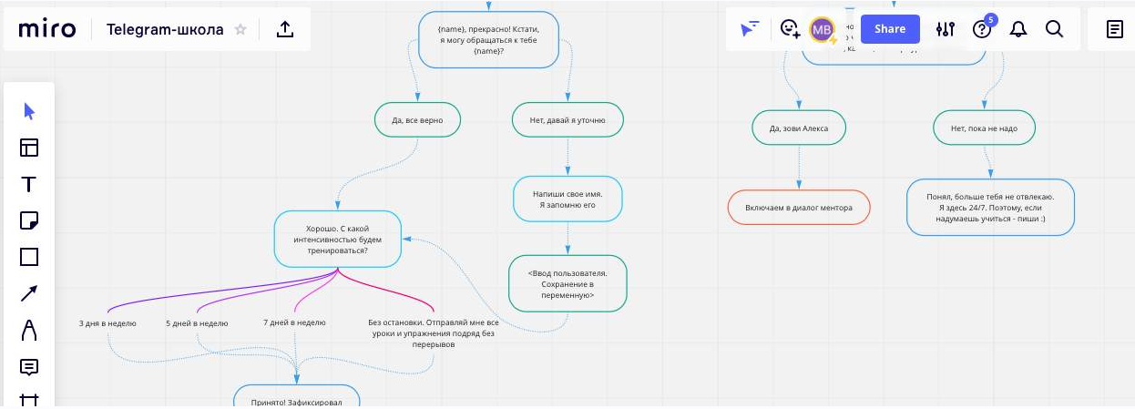В данных сценариях мы описываем то, как бот должен и будет себя вести с потенциальными покупателями наших образовательных продуктов и теми, кто уже учится в нашей школе. Так, в отношении первых, бот постепенно прогревает потенциального слушателя, технично доводит его до совершения покупки. А далее, полностью управляет образовательным процессом.